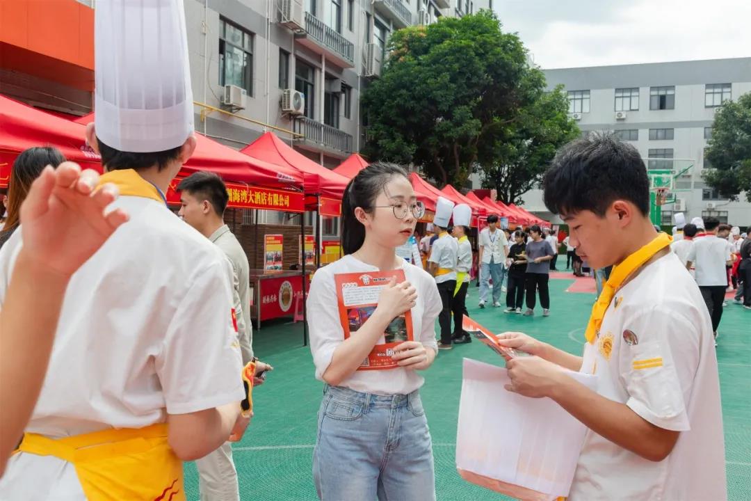 中餐、西点、西餐专业的学子纷纷寻找自己意向的企业,看资料简介,听企业招聘团队介绍公司情况、薪资待遇、未来发展等情况,填写个人简历,自信满满准备面试。各企业招聘人员也热情的向同学们抛出橄榄枝,期待能将优秀人才纳入自己的团队,为企业建设添砖加瓦注入新的力量。