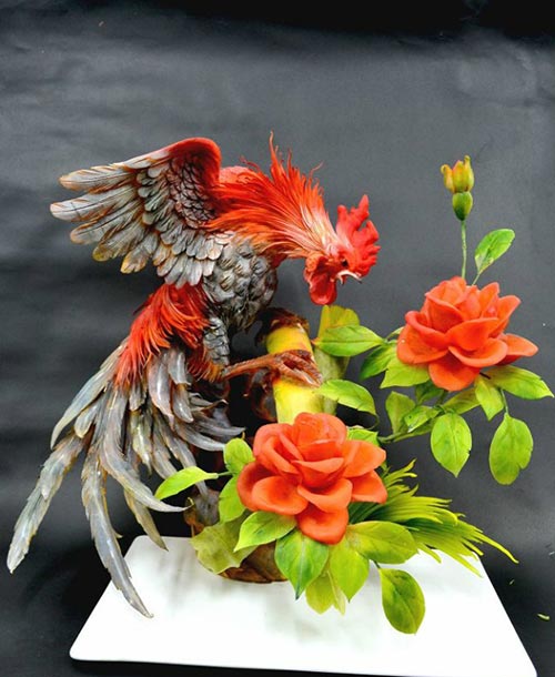 斗志昂扬:雄鸡羽翼丰满,振翅欲飞,形体高大英武,昂首屹立。